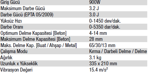 Tüm profesyonel uygulamalar için üç farklı çalışma modu darbesiz delme, darbeli delme ve kırma özelliği vardır. 22mm çapında geniş darbe mekanizması, parçalar üzerindeki yükü azaltarak yüksek performans sağlar. Darbe özelliği taş, tuğla, seramik ve betonda darbeli delme ve kırma için uygundur. Mükemmel dönüş ve darbe hızı yüksek verimlilik sağlar.